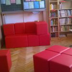 Dank einer großzügigen Spende konnten neben Büchern variable Aufbewahrungsregale sowie schöne rote Sitzwürfel angeschafft werden.